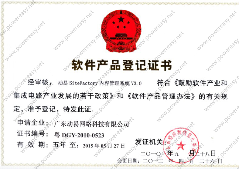 軟件產(chǎn)品登記證書(shū) 動(dòng)易SiteFactory內(nèi)容管理系統(tǒng)V3.0