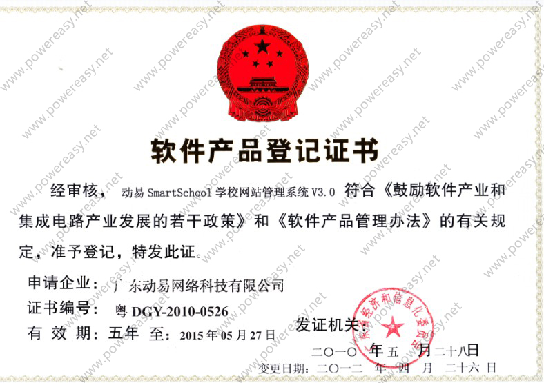 軟件產(chǎn)品登記證書(shū) 動(dòng)易SmartSchool學(xué)校網(wǎng)站管理系統(tǒng)V3.0