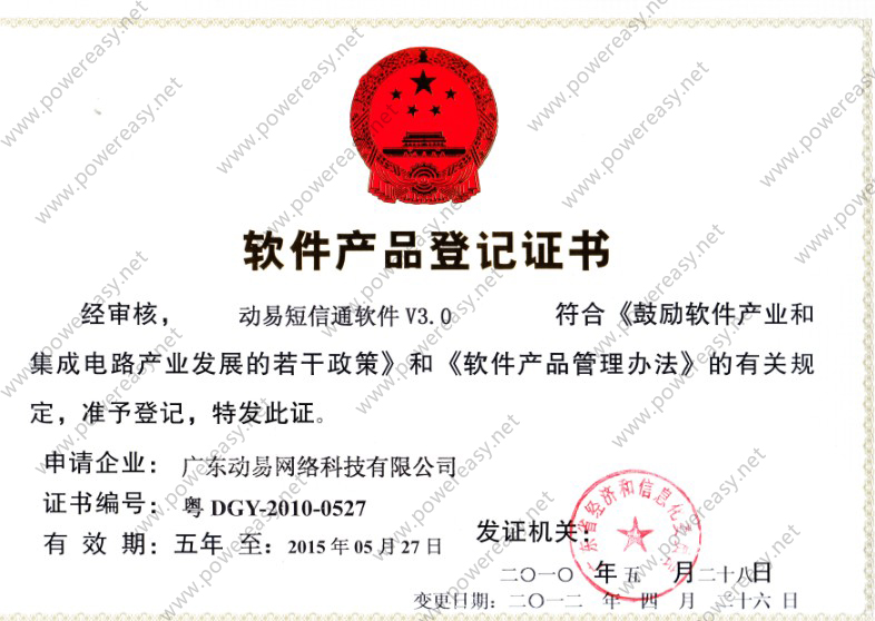 軟件產(chǎn)品登記證書(shū) 動(dòng)易短信通軟件V3.0
