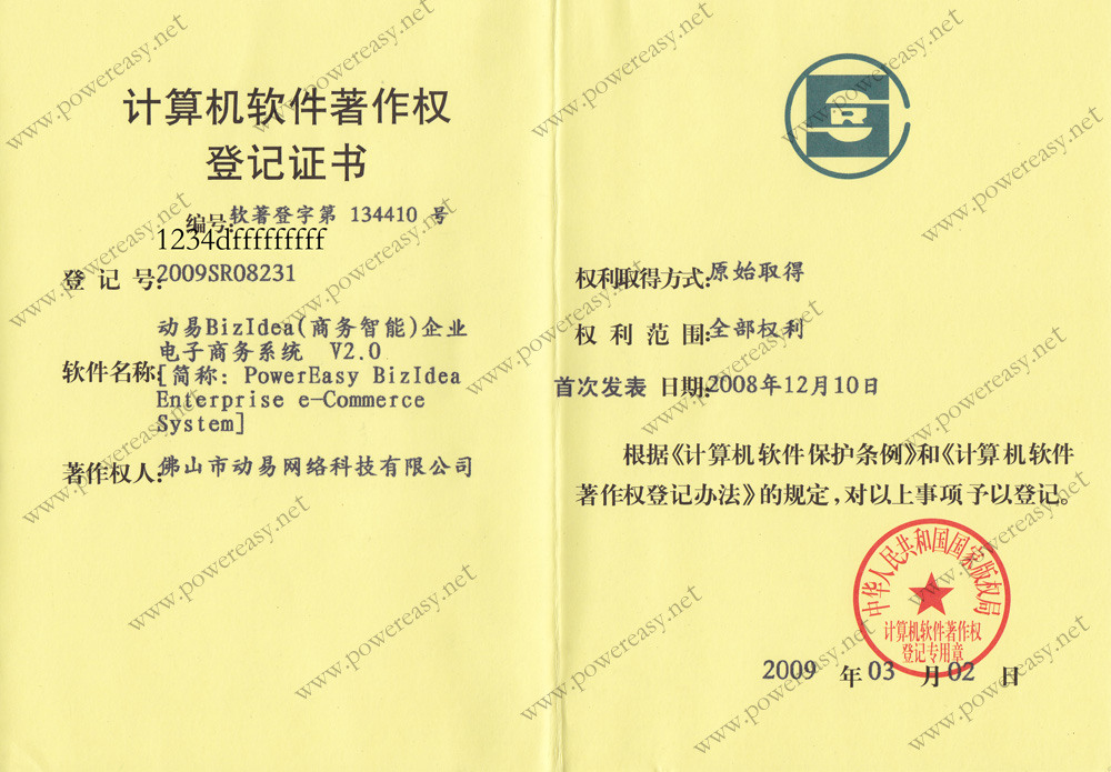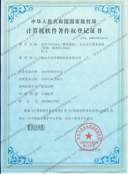 軟件產(chǎn)品登記證書(shū) 動(dòng)易BizIdea企業(yè)電子商務(wù)系統(tǒng)V3.0