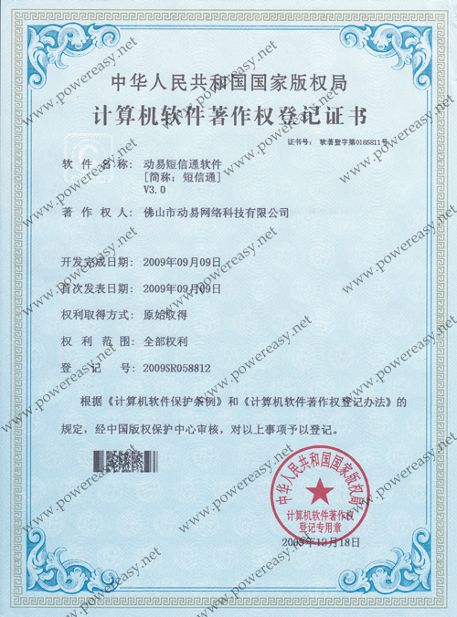 計(jì)算機(jī)軟件著作權(quán)登記證書(shū) 動(dòng)易 短信通 V3.0