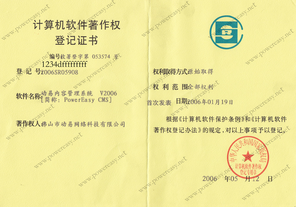軟件著作權(quán)登記證書(shū) 動(dòng)易內(nèi)容管理系統(tǒng)V2006