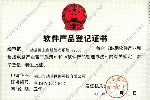 軟件產(chǎn)品登記證書(shū) 動(dòng)易網(wǎng)上商城管理系統(tǒng)V2006