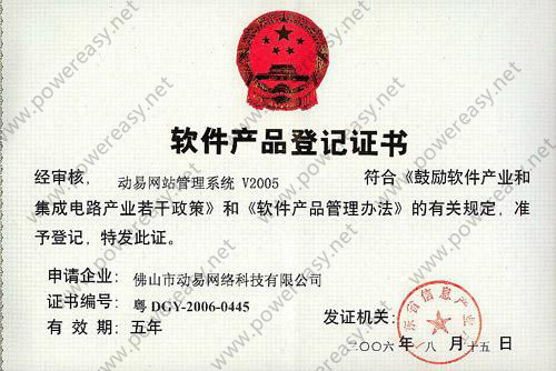 軟件產(chǎn)品登記證書(shū) 動(dòng)易網(wǎng)站管理系統(tǒng)V2005