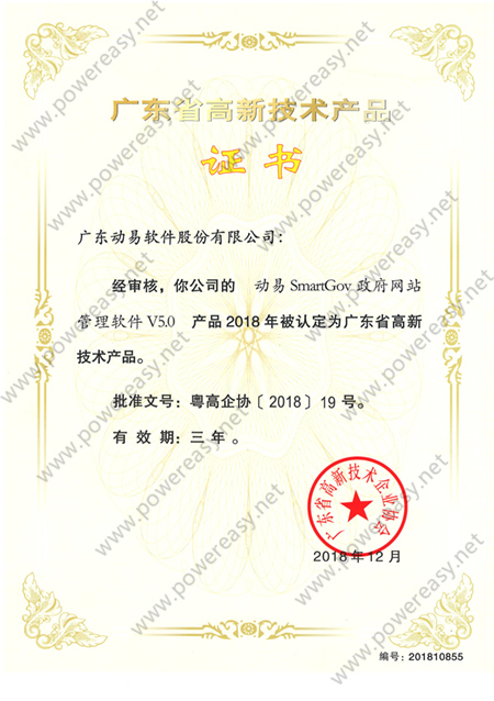 廣東省自主創(chuàng)新產(chǎn)品認(rèn)定證書(shū) 動(dòng)易SmartGov V3.0