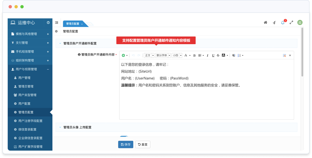 支持對(duì)角色分配權(quán)限,管理員通過(guò)所屬角色來(lái)獲得角色擁有的操作權(quán)限。一個(gè)角色可以擁有多個(gè)管理員,一個(gè)管理員可以屬于多個(gè)角色。