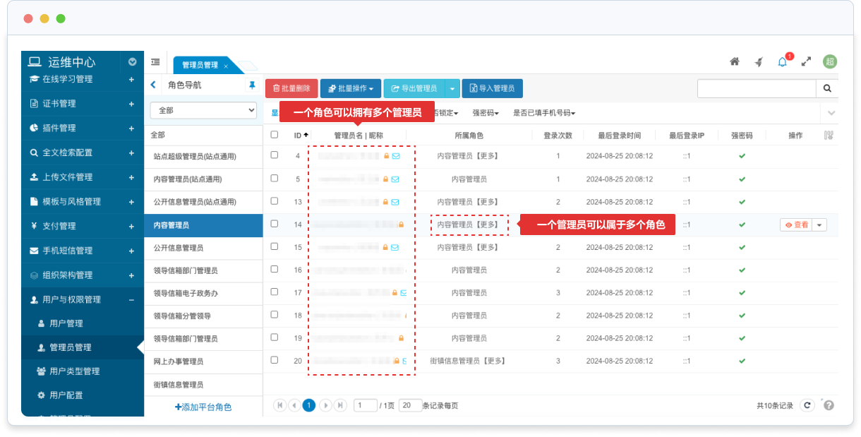 管理員可以歸屬于多個(gè)站點(diǎn),在每個(gè)站點(diǎn)中可以屬于不同站點(diǎn)角色,以滿(mǎn)足跨站點(diǎn)管理的業(yè)務(wù)需求。