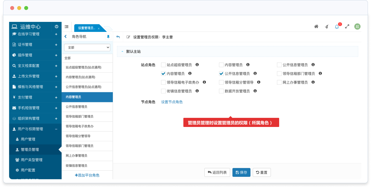 角色根據(jù)權(quán)限范圍分為平臺(tái)角色(平臺(tái)超級(jí)管理員和平臺(tái)普通管理員)、站點(diǎn)角色(站點(diǎn)超級(jí)管理員和站點(diǎn)普通管理員)以及節(jié)點(diǎn)角色三級(jí)。節(jié)點(diǎn)角色的權(quán)限進(jìn)一步細(xì)分為三類(lèi):操作權(quán)限(如查看、錄入、修改、審核、管理等,其中審核權(quán)限可按多級(jí)審核流程分配至各審核步驟)、數(shù)據(jù)操作范圍(自己的/部門(mén)的/所有人的)、字段權(quán)限(角色在錄入和修改界面中可設(shè)置哪些字段的值)。通過(guò)配置各欄目(節(jié)點(diǎn))節(jié)點(diǎn)角色的管理員,可以為不同欄目指派特定管理員進(jìn)行管理。