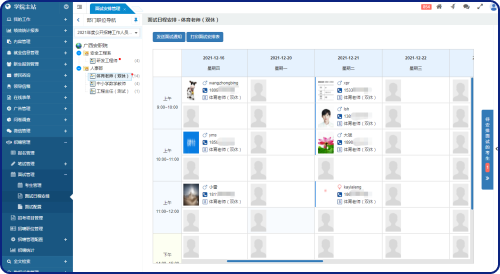中欄為本次招生考試項(xiàng)目的班級列表,每個(gè)班級名稱后顯示相應(yīng)的進(jìn)入面試流程的考生總數(shù),假如有“待安排面試時(shí)間”的考生,則用紅點(diǎn)進(jìn)行提醒。右側(cè)為待安排面試考生列表,中間為面試日程安排表。
