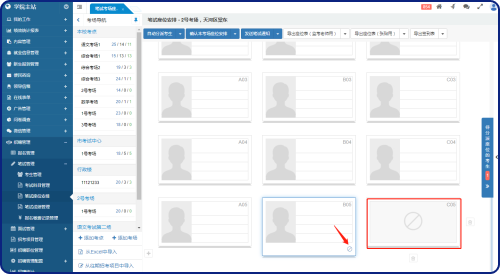 筆試考生管理的界面與報(bào)名管理類似,中欄為本次招生考試項(xiàng)目的班級列表,每個(gè)班級名稱后顯示相應(yīng)的進(jìn)入筆試流程的考生總數(shù),假如有“待安排座位”的考生,則用紅點(diǎn)進(jìn)行提醒。中欄頂部支持切換招生考試項(xiàng)目。