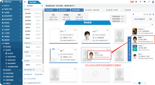 提供座位調(diào)整、自動分派考生座位、手動分派考生、確認(rèn)座位安排、導(dǎo)出座位表(監(jiān)考老師用)、導(dǎo)出座位表(張貼用)、導(dǎo)出簽到表功能。以及為所有考場自動分派考生、確認(rèn)所有考場的座位安排、導(dǎo)出所有考場的座位表(監(jiān)考老師用)、導(dǎo)出所有考場的座位表(張貼用)、導(dǎo)出所有考場的簽到表操作。