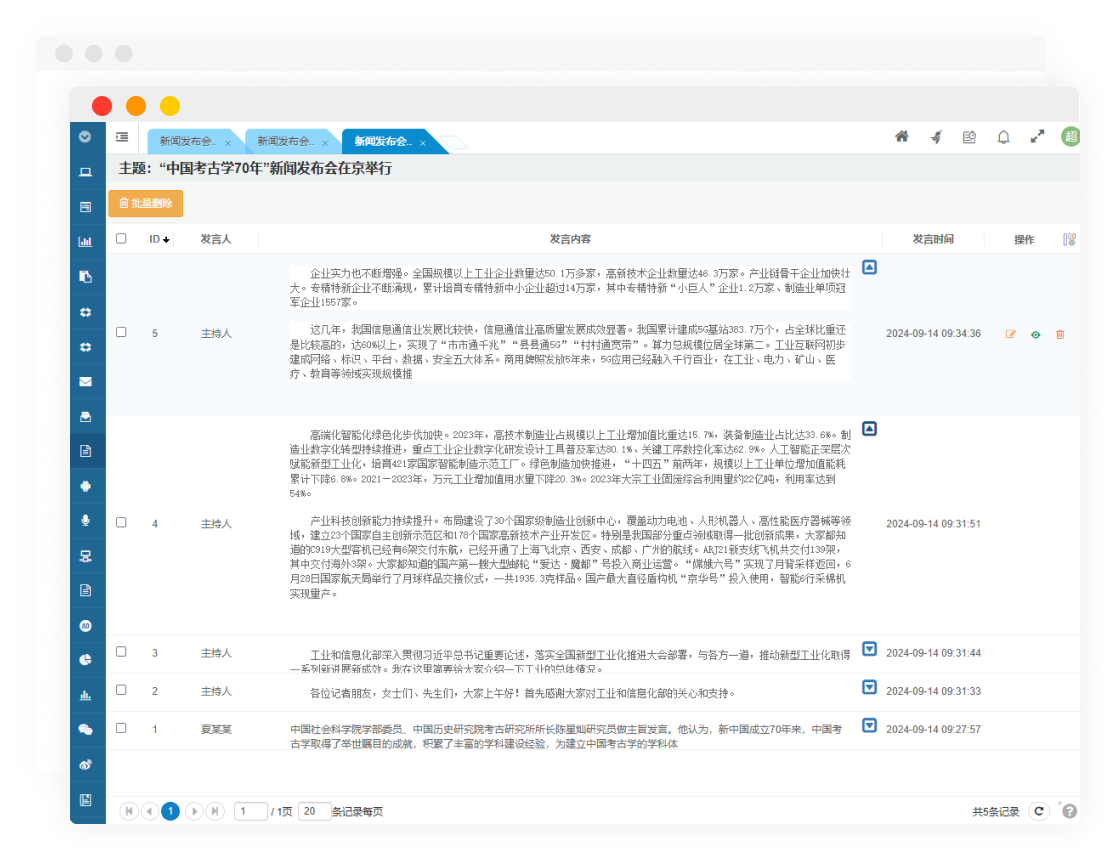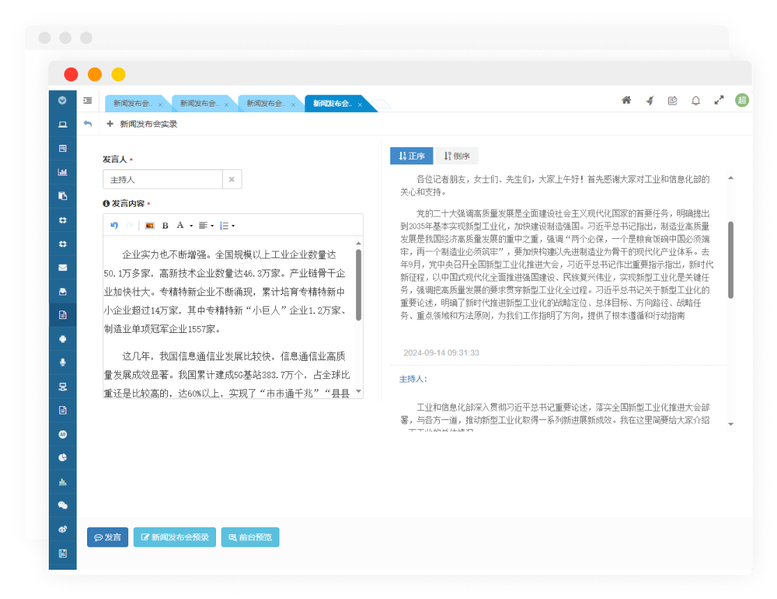 系統(tǒng)涵蓋新聞發(fā)布管理、發(fā)布會(huì)預(yù)錄管理、視頻直播與錄播、新聞圖文直播(實(shí)時(shí)推送)、網(wǎng)友提問、相關(guān)內(nèi)容管理與分類管理、新聞發(fā)布會(huì)配置等功能模塊。支持圖文直播與視頻直播功能,并內(nèi)置文字敏感詞過濾功能,確保發(fā)布內(nèi)容的安全與合規(guī)。