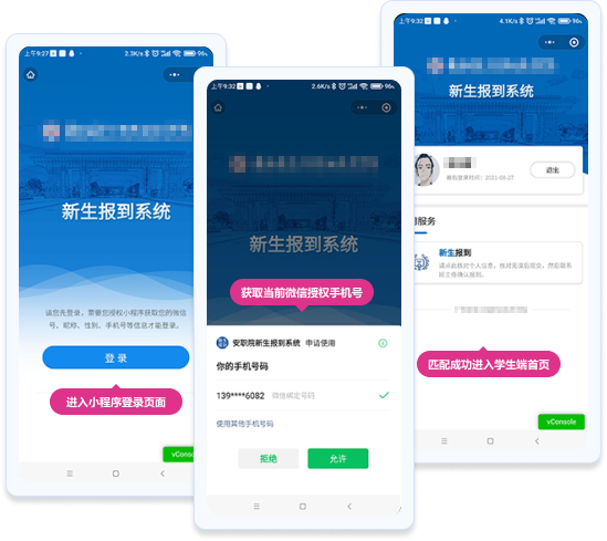 新生報到的學(xué)生端通過微信小程序?qū)崿F(xiàn)。學(xué)生到校后,掃描學(xué)校公布的小程序二維碼,進入小程序。小程序會自動獲取當(dāng)前微信綁定的手機號,并與新生報到數(shù)據(jù)進行匹配。