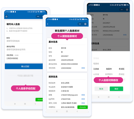 如果手機號未能與系統(tǒng)中的新生數(shù)據(jù)匹配,系統(tǒng)將提示學(xué)生在小程序頁面中填寫【姓名+身份證號+原手機號】進行數(shù)據(jù)匹配。匹配成功后,進入個人信息核對步驟。