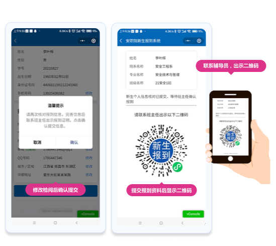 如果匹配成功,系統(tǒng)將顯示學(xué)生的院系、專業(yè)、班級、個人信息等內(nèi)容。新生需核對個人信息,如有誤,可以根據(jù)實際情況進行修改,并提交更改。系統(tǒng)會彈出確認(rèn)信息窗口,點擊【確認(rèn)提交】按鈕后,系統(tǒng)會根據(jù)學(xué)生的身份證和當(dāng)前時間生成一個二維碼。