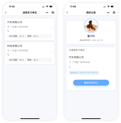支持顯示可選的實(shí)習(xí)單位和剩余名額并一鍵選擇;