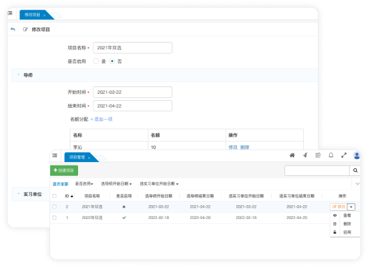 具有獨(dú)創(chuàng)的“項(xiàng)目管理”功能,不僅支持保管歷史數(shù)據(jù),而且能解決“學(xué)生、導(dǎo)師、實(shí)習(xí)單位“每一年都不同的難度。