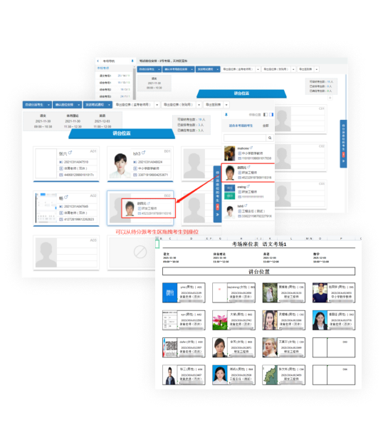 系統(tǒng)創(chuàng)新的將“組織筆試”環(huán)節(jié)納入到在線招考流程中,并獨創(chuàng)了一系列方便、好用的功能:例如所見即所得的考場和座位布置、自動分派考生、拖拽調整考生座位、一鍵導出座位安排表和簽到表等,將原來需要手動在Excel中進行處理的繁瑣座位安排工作變成只要點幾下鼠標就可以了,原來可能需要幾天時間來安排座位,現(xiàn)在只要幾分鐘就可以了。