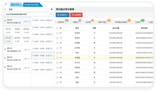 點(diǎn)擊面試地點(diǎn)、時(shí)間或時(shí)間段時(shí),自動(dòng)關(guān)聯(lián)并顯示考生信息;