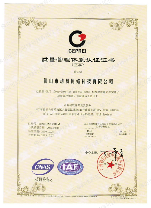 近日,佛山市動(dòng)易軟件科技有限公司正式通過賽寶認(rèn)證中心的認(rèn)證審核,取得了ISO9001:2008質(zhì)量體系認(rèn)證證書。