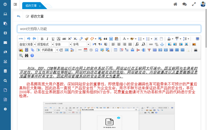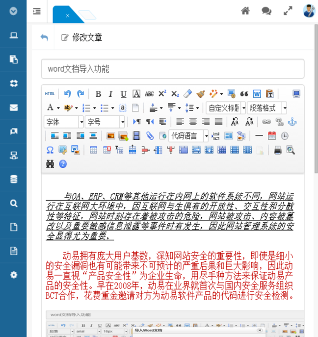 此外,動易SiteAzure 還對一些大型控件進行了選型和完善,如全新升級的內容編輯器,在保持原有編輯器功能的基礎上,加入了 Word 文檔直接導入、一鍵格式化紅頭文件、三屏無縫內容輸入等功能;再如可視化圖表控件,直觀,生動,可交互,支持折線圖(區(qū)域圖)、柱狀圖(條狀圖)、餅圖(環(huán)形圖)等常見圖表類型。