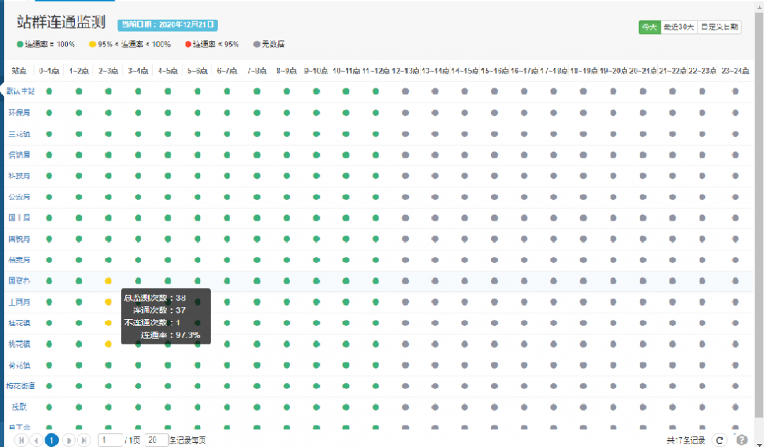 采用仿交換機(jī)面板的亮燈圖方式顯示所有站點(diǎn)的連通監(jiān)測(cè)結(jié)果,可直觀了解到各時(shí)間段連通情況。