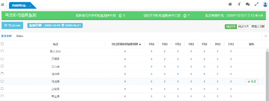 按站點(diǎn)顯示各站點(diǎn)的便民咨詢逾期辦理情況的監(jiān)測(cè)結(jié)果。