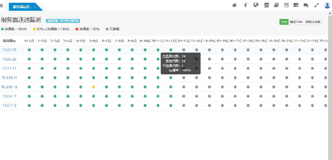 采用仿交換機(jī)面板的亮燈圖方式顯示所有服務(wù)器的連通監(jiān)測(cè)結(jié)果,可以直觀的了解到各時(shí)間段連通情況。