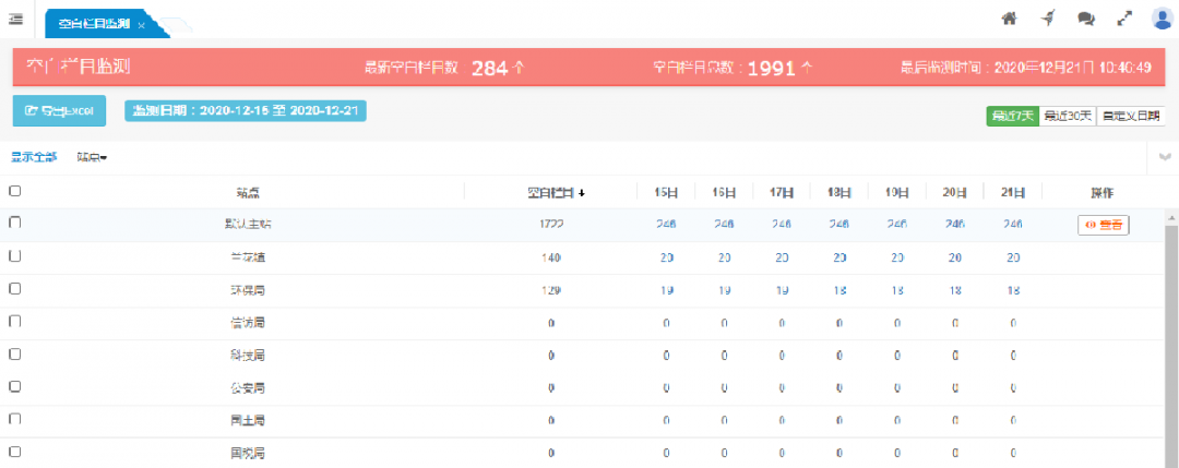 按站點(diǎn)顯示各站點(diǎn)的空白欄目監(jiān)測(cè)情況。