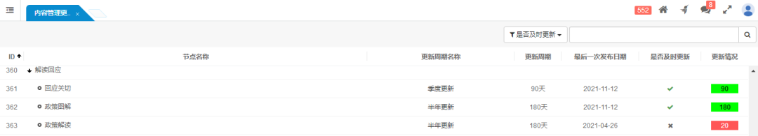 系統(tǒng)提供了監(jiān)測中心及績效統(tǒng)計報表功能,可以對政策文件\政策解讀的發(fā)布情況進行統(tǒng)計、對更新情況進行日常監(jiān)測。此外,系統(tǒng)還提供內(nèi)容更新預警功能,擁有權限的管理員可以收到信息提醒通知。