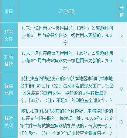 政策解讀是政府網(wǎng)站績效考核的一個重要部分,涉及考核分值16分(政策文件+政策解讀+解讀比例+解讀關聯(lián))。關于政策解讀的主要內(nèi)容, 在2019年4月1日 《國務院辦公廳秘書局關于印發(fā)政府網(wǎng)站與政務新媒體檢查指標、監(jiān)管工作年度考核指標的通知》可以看到: