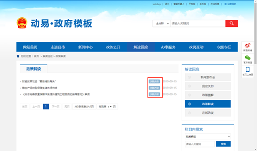 解讀材料上應隨政策文件同步在政府網(wǎng)站予以公開發(fā)布。在動易系統(tǒng)中,管理員發(fā)布政策解讀時,可將解讀材料和被解讀的政策文件相互關聯(lián)。