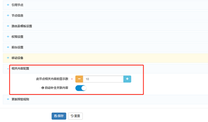 系統(tǒng)提供了“相關內(nèi)容補全”功能。開啟這個功能后,當手工設置的相關內(nèi)容數(shù)量達不到在此節(jié)點相關內(nèi)容的顯示數(shù),或沒有手工設置相關內(nèi)容時,系統(tǒng)自動通過全文檢索功能找到包含了在“關鍵詞”字段中設置的關鍵詞內(nèi)容,并填充到相關內(nèi)容列表中,以盡量保證足額顯示相關內(nèi)容。