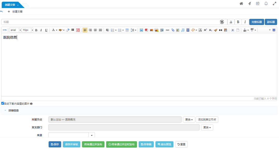 網(wǎng)站后臺(tái)提供對(duì)網(wǎng)站所有信息進(jìn)行添加/刪除、查詢、搜索、簽收、審核、歸檔、替換、退稿等豐富的信息管理功能,配合強(qiáng)大的后臺(tái)內(nèi)容編輯器,方便醫(yī)院門戶網(wǎng)站構(gòu)建起強(qiáng)大的內(nèi)容信息及咨詢管理平臺(tái)。