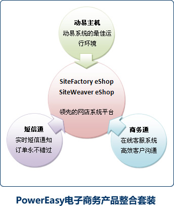 | 動(dòng)易電子商務(wù)產(chǎn)品整合方案由四大產(chǎn)品組成,分別是:動(dòng)易電子商務(wù)軟件系統(tǒng)、動(dòng)易短信通、動(dòng)易主機(jī)、網(wǎng)站商務(wù)通。他們構(gòu)成了動(dòng)易電子商務(wù)產(chǎn)品整合方案的有機(jī)整體。 1、動(dòng)易eShop電子商務(wù)軟件:是整個(gè)方案的核心,強(qiáng)大的企業(yè)級(jí)系統(tǒng)功能平臺(tái)能支持各類B2C業(yè)務(wù)運(yùn)營(yíng)。 2、動(dòng)易主機(jī):作為動(dòng)易軟件的最佳運(yùn)行伙伴,能提供給客戶IT業(yè)務(wù)最優(yōu)的運(yùn)行平臺(tái)環(huán)境支持。 3、動(dòng)易短信通:與動(dòng)易軟件無縫銜接,在動(dòng)易軟件中內(nèi)置強(qiáng)大的短信通功能,包括有:訂單手機(jī)通知商家、已收款通知,顧客發(fā)貨通知等,更可發(fā)送最新商品資訊、促銷打折信息給網(wǎng)店會(huì)員,還可進(jìn)行會(huì)員節(jié)日生日問候。 4、網(wǎng)站商務(wù)通:在線客服軟件。是一個(gè)極為強(qiáng)大的網(wǎng)店商家與網(wǎng)店顧客的在線溝通工具。通過商務(wù)通,商家可以與網(wǎng)店訪客進(jìn)行主動(dòng)溝通銷售,提供更加時(shí)效的銷售咨詢服務(wù)。 |