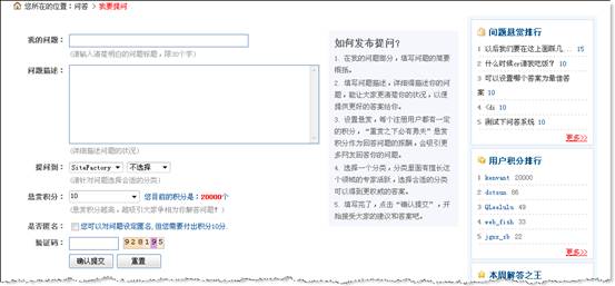 提問頁面與國內(nèi)知名的百度知道、新浪愛問相似,均支持標題、內(nèi)容描述、分類選擇、積分懸賞、匿名設(shè)定、以及驗證碼等各項主要內(nèi)容。目前不提供上傳圖片的問題支持,這是因為如果開放傳圖就會涉及安全、頁面樣式破壞等問題,而目前一般的問答如百度等都沒有對圖片進行支持。