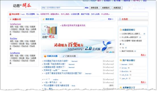 通過上圖我們可以發(fā)現(xiàn),目前動易問答系統(tǒng)功能已經(jīng)基本完整了。從最頂部的“會員登錄”、“我的問答”到“我要提問”、“我要回答”等功能均已完成;同時也已經(jīng)完成了“問題兩級分類”、“待解決問題”與“已解決問題”區(qū)分,“用戶積分排名”、“本周解答之王”、“問題懸賞排名”等我們常見的問答功能模塊。一句話,這個預覽版已經(jīng)頗具規(guī)模!