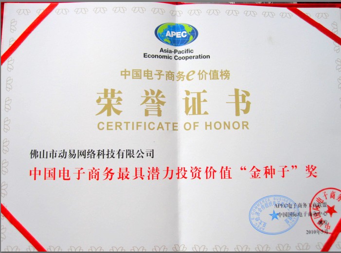 2010年5月21日,由APEC(亞太經(jīng)濟合作組織)和中華人民共和國商務(wù)部在四川成都主辦的“第四屆APEC電子商務(wù)工商聯(lián)盟論壇”傳出喜訊,按照“成長性、創(chuàng)新性、影響力和經(jīng)典案例”等四項評選標準,經(jīng)組委會嚴謹評定,作為“全程式電子商務(wù)解決方案”的開創(chuàng)者,國內(nèi)最大的網(wǎng)站管理系統(tǒng)提供商,動易公司榮膺“中國電子商務(wù)最具潛力投資價值‘金種子獎’”!。