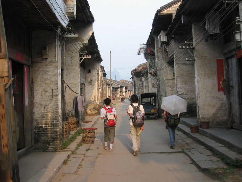先乘小巴士到楊堤,一下車便有過來問要不坐竹排或坐車甚至有買水果的老太太。大概是這附近的本地人吧!知道這里有很多要徒步漓江的步行者,所以來拉點(diǎn)小買賣。這里離徒步漓江的渡口還很遠(yuǎn),經(jīng)過我們的團(tuán)長(zhǎng)的一翻努力和討價(jià)還價(jià)后,最后終于決定做一兩三輪摩托車去渡口。一起的有兩對(duì)年輕人及一位湖南來的美女,一路有說有笑不在話下。到了渡口各自分散,買票過江就沿漓江岸邊走。走不遠(yuǎn)就迎面走來一位大嬸,皮膚曬得還是比較黑了,問我們要不要坐竹。不知不覺就當(dāng)起我們的免費(fèi)導(dǎo)游來了,還是挺能說的,真不比有證的導(dǎo)游差到哪里去的。不過我們還是先跟她說明了,竹排我們不一定坐的。她也表明不一定要我們坐,也不收我們的導(dǎo)游費(fèi),只是一直不肯放棄我們這幾個(gè)徒步者。就這樣走著無意中又遇到剛剛一起坐三輪摩托車的那位美女。她是一個(gè)人出來旅游的,也是打算徒步漓江,我們剛好可以結(jié)伴同行。在談話中越發(fā)覺得還是瞞有氣質(zhì)和挺有性格的。一個(gè)女孩子能一個(gè)人去很多地方游玩,使我不得不佩服。本來我們打算先再走一段才坐竹排的,再我們的免費(fèi)導(dǎo)游的不斷的建議下我們最終還是決定先坐竹再走路。