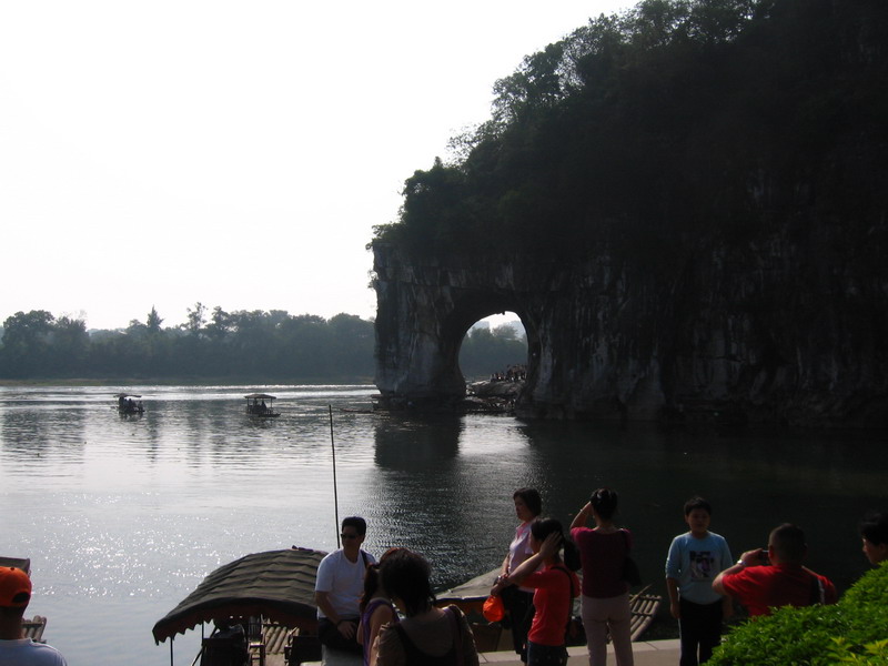 走了不久就見到象鼻山了,還真不減當(dāng)年的氣勢(shì)。由于游人很多,要照到一張沒有人山合影的還真難呢?這里的游人還有不少的外國朋友,我注意到他們大部分跟我們這幾個(gè)小伙子一樣自助游噢!漓江的水現(xiàn)在還是清澈見底的,不是很寬也不是很深,站在旁邊看比較淺的地方還能看到水草和鵝卵石。江邊還挺靠著很多竹排和小船還有游船。也有江邊燒烤漓江小魚的,在強(qiáng)烈的陽光下,時(shí)而吹來了微風(fēng)夾著淡淡的魚香味直讓人不斷咽口水。大概是怕上火很多游人包括我也沒敢去嘗試,不過還是有去試的。還時(shí)不時(shí)的聽到一些旅游團(tuán)的導(dǎo)游用喇叭給游客們講解。靜聽了一會(huì)就離開了,不遠(yuǎn)處有雜技表演。手拋多個(gè)羽毛球拍、小球,還有嘴叼筷子頂氣球及變臉等等。我們先到處轉(zhuǎn)了轉(zhuǎn),照些相片最后決定到象鼻山的象鼻子下站一站。這有水路和陸路都可以到達(dá),暈,一問水路的竹排20元,就幾米嘛!所以我們就馬上打算另尋小路過去,跟著其他游人最后還是到達(dá)了我們想去的地方。還爬了象鼻山,這時(shí)總算把整個(gè)象鼻山公園給游遍了。要不是有這依舊秀美的漓江水和高大的像鼻山,大老遠(yuǎn)跑來看公園真會(huì)讓人失望的。還照了些相片就離開象鼻山了。
