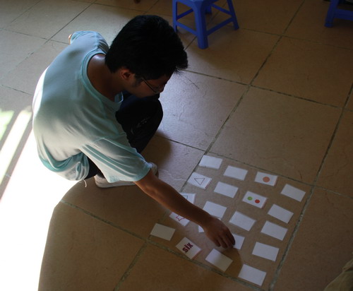 下午陽(yáng)光更猛烈,在做了幾個(gè)指令聽(tīng)起來(lái)簡(jiǎn)單,結(jié)果卻讓大家亂成一團(tuán)糟的團(tuán)體小游戲之后,第一個(gè)名叫“達(dá)芬奇密碼”的拓展項(xiàng)目開(kāi)始了。這個(gè)活動(dòng)規(guī)則是:每隊(duì)一名教練坐在隊(duì)伍大概四、五米開(kāi)外,面前擺了20張覆蓋著的牌,每張牌的圖案都不同,每隊(duì)每次派出一個(gè)人去翻牌,如果翻對(duì)了那么可以繼續(xù)翻下一張,如果翻錯(cuò)了那么前面已翻的牌都要重新覆蓋,所以需要前一個(gè)翻牌的人記住自己翻的牌,然后傳達(dá)給下一個(gè)人。我們隊(duì)一開(kāi)始商量了非常完美的策略:即每個(gè)人按順序去翻一張牌,不管翻對(duì)翻錯(cuò)都先把牌的內(nèi)容記下來(lái),回來(lái)后報(bào)給負(fù)責(zé)記錄的同事,等把所有圖案都記下來(lái)之后,再來(lái)尋找規(guī)律,根據(jù)規(guī)律再去翻第二輪。我們幾個(gè)女孩子是負(fù)責(zé)記錄的,每個(gè)人回來(lái)后都把自己看到的圖案報(bào)給我們,有的是圓,有的是星星,有的是花瓶,有的是一對(duì)手,有的是一對(duì)腳……還有一些復(fù)雜的圖案,只能勉強(qiáng)用文案或圖案記錄下來(lái)。等到第一輪翻完再來(lái)看所有圖案找規(guī)律時(shí),卻勉強(qiáng)從1找到7之后就陷入了僵局,再也找不下去了,去翻了好幾次都是錯(cuò)的,因?yàn)槊總€(gè)人都只知道自己看到的內(nèi)容,根本無(wú)法跟其他人的聯(lián)系起來(lái)。幸好第二輪的規(guī)則有了些小小的不同,即使是翻開(kāi)錯(cuò)誤的牌也不用再把前面的牌再覆蓋了,下一個(gè)人可以接著再翻另一張。于是在剩下不多的時(shí)間內(nèi)無(wú)法再講究其他什么理論上的策略,唯有比拼速度,每組都是一個(gè)接一個(gè)人快速地跑過(guò)去翻牌,這樣下去總有翻對(duì)的時(shí)候。如此一來(lái)靠著男同胞們的體力,我們隊(duì)勉勉強(qiáng)強(qiáng)在規(guī)定時(shí)間內(nèi)完成了這個(gè)游戲,但相比之下成績(jī)并不是特別好,只拿到第三名,之前落后的劍人隊(duì)反倒拿了第一名。