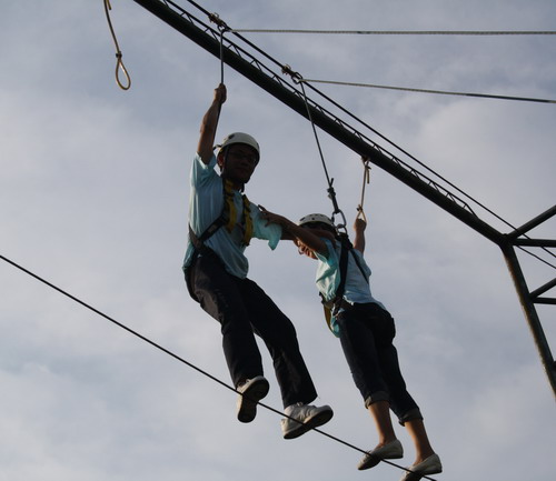 接下來(lái)的室外“個(gè)人突破高空項(xiàng)目”我覺(jué)得應(yīng)該算是當(dāng)天最刺激的一個(gè)活動(dòng)吧。我們四隊(duì)分別挑戰(zhàn)不同的高空項(xiàng)目,我們隊(duì)分配到的是“高空平衡木”,要先從旁邊的三角架往上爬,爬到大概二、三層樓高的時(shí)候走上一根平衡木,走過(guò)平衡木之后再依靠安全帶的力量從高空上“飛”下來(lái)。我們組的靚女曹倩很勇敢地第一個(gè)上了,而且很順利地走了下來(lái)。我一向有些畏高,平時(shí)上到三樓以上再往下望都會(huì)覺(jué)得頭暈,特別是看到同組的阿燕下來(lái)后眼圈都紅了,不禁更讓我打怵起來(lái),但畏畏縮縮不是辦法,到最后也只能硬著頭皮上了。爬鐵架倒是挺輕松的,每個(gè)農(nóng)村的孩子都有爬過(guò)樹(shù)的經(jīng)歷,但站上了平衡木,第一感覺(jué)就是心慌,我背靠在三角架的柱子上不敢離開(kāi)絲毫,也不敢往下看,同事們都在下面鼓勵(lì)我,大聲叫著讓我邁出第一步。我閉了閉眼睛,深呼了一口氣,邁出了自己的右腳,但手還是扶在身后不敢松開(kāi)。其他組的同事在鐵架的另一邊活動(dòng),以致于平衡木晃得很厲害,我覺(jué)得自己隨時(shí)都可能摔下去,雖然知道身后掛有安全帶,但那種恐懼感卻是與生俱來(lái)的,怎么也揮不去。就這樣我站在平衡木上進(jìn)退不得,腦門(mén)上都是汗,但事已至此,似乎沒(méi)有其他選擇了,我定了定神,慢慢放開(kāi)了手,開(kāi)始邁出第二步。真正邁開(kāi)了步子沒(méi)有了依靠心里的恐懼反而倒消失了,我三步二步就走到了平衡木的中間,終點(diǎn)就在眼前了,在最后晃悠了一下,差點(diǎn)滑下去之前我終于抓住了終點(diǎn)的鐵架,那一瞬間我繃緊的神經(jīng)終于松弛了下來(lái),下來(lái)的時(shí)候吊著安全帶享受了象小鳥(niǎo)一樣的短暫飛翔,那是以前從未體驗(yàn)過(guò)的感覺(jué)。落地那一刻心情真是前所未有的輕松,再看看其他組挑戰(zhàn)的高空項(xiàng)目,發(fā)現(xiàn)我錯(cuò)過(guò)了不少精彩,相比較我們組的項(xiàng)目,其他組挑戰(zhàn)的“高空走鋼絲”和“跳出真我“更加驚險(xiǎn)及刺激,但每個(gè)人都在勇敢地挑戰(zhàn)自己的極限。雖然下來(lái)后福娃取笑我在平衡木上腿肚子一直在打顫,但我終究是走過(guò)來(lái)了,這一次,我也真正挑戰(zhàn)了我自己!