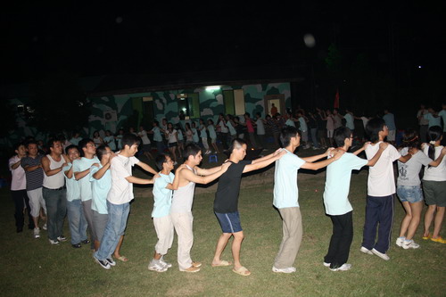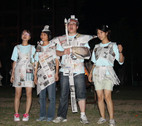 在所有活動(dòng)結(jié)束之后教練宣布了今天一天活動(dòng)的累計(jì)成績(jī),我們雷隊(duì)以七十多分的總分拿到了第一名,大家歡呼雀躍著,心頭也不禁冒出了身為團(tuán)隊(duì)成員的自豪感。隨后教練分發(fā)給每組一疊報(bào)紙、一把剪刀和一卷膠帶,宣布了晚上篝火晚會(huì)的重頭活動(dòng)是“環(huán)保服裝秀”,同時(shí)名列后兩名的十八羅漢隊(duì)和野狼隊(duì)還必須再各出一個(gè)節(jié)目。我們雷隊(duì)沒(méi)有準(zhǔn)備節(jié)目的壓力,所以大家都顯得相當(dāng)輕松,吃完飯后一起去了福娃的宿舍,大家商量著要用報(bào)紙裁剪出什么樣的服裝,不過(guò)時(shí)間不多,我們大家又都不是特別手巧的人,既然有福娃和NONO這兩大猛男做模特,服裝不做的熱辣刺激一些那就真是對(duì)不起觀眾了。定下了服裝的風(fēng)格,我們幾個(gè)女孩子三下五除二,就剪出兩件火辣辣的草裙,既然是“猛男+草裙”,那我們隊(duì)節(jié)目的名稱(chēng)就叫做“夏威夷風(fēng)情秀”了。
