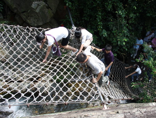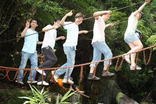 下午的活動(dòng)“山谷探險(xiǎn)”就顯得比較簡(jiǎn)單了,說(shuō)白了就是去登山。我們所去的二龍谷是位于景區(qū)內(nèi)一條比較隱蔽的幽谷,景區(qū)為了滿(mǎn)足游客的需要,在一些險(xiǎn)要位置增加了鋼索吊橋、輪胎索等設(shè)施。我們先乘車(chē)去了山谷的入口處,然后從橫跨河道的鋼索吊橋進(jìn)入山谷,沿著溪水溯溪而上,踩過(guò)輪胎索,越過(guò)“仙月池”,攀登“天梯”,有好幾處必須要手腳并用才可以爬上去,原來(lái)拿在手里的礦泉水也因?yàn)榈K事在半路上丟掉了,后來(lái)才發(fā)現(xiàn)這真是一個(gè)錯(cuò)誤的決定,因?yàn)橐宦放实巧先ズ顾疂L滾而下,不到一會(huì)兒就恨不得能喝下一桶水,雖然沿途的溪水不斷從石縫間潺潺淌流出來(lái)清澈見(jiàn)底,但始終還是不敢去冒然喝解渴,唯有歇息下來(lái)的時(shí)候洗把臉,或者拿來(lái)當(dāng)作“武器”來(lái)澆一澆其他的同事,倒也為這悶熱的天氣帶來(lái)一份清涼。正所謂上山容易下山難,下山的時(shí)候我感覺(jué)自己的腿一直在打顫,好不容易一路顛簸著下山了,坐在入口處的涼亭處,吹著習(xí)習(xí)的涼風(fēng),嗅著山里獨(dú)有的樹(shù)木的清香,看著鋼索橋下一路漂流下來(lái)歡騰的人們,那一瞬間真有種置身世外的感覺(jué)。