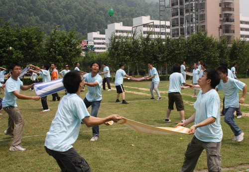 第一個(gè)正式的拓展項(xiàng)目名稱(chēng)叫做“南水北調(diào)”,玩法是各組每2人站成一對(duì),每對(duì)人手上拿一塊毛巾,每組分配有30個(gè)汽球全部裝好水,將水球放到毛巾上,每次一個(gè)由各隊(duì)成員依次以接龍形式從第一對(duì)隊(duì)員手中的毛巾上傳送到最后一對(duì)隊(duì)員手里的毛巾上,最后把水球送到終點(diǎn)的桶里,拿到最多水球的隊(duì)伍可得最高分。初聽(tīng)說(shuō)明時(shí)貌似這個(gè)游戲很簡(jiǎn)單,到真正進(jìn)行時(shí)才發(fā)現(xiàn)遠(yuǎn)遠(yuǎn)不是想象中那么容易:因?yàn)槊繉?duì)隊(duì)員相距好幾米遠(yuǎn),要利用毛巾的彈力將水球準(zhǔn)確無(wú)誤地送到下一對(duì)隊(duì)員手中的毛巾上,兩個(gè)人的力道要配合的相當(dāng)好,用力過(guò)猛水球就飛過(guò)頭了,用力太輕水球又飛不過(guò)去,而且水球砸在地上,很容易就破掉了。所以在開(kāi)始一段時(shí)間內(nèi),我們隊(duì)毫無(wú)進(jìn)展,有時(shí)候好不容易前兩對(duì)的人員運(yùn)送成功,下一組的運(yùn)送又失敗了。不過(guò)幸好每隊(duì)安排有一個(gè)靈活撿球的“走鬼”,這下子就苦了我們隊(duì)里的小歐童鞋,他四處飛奔,不僅要撿回自己隊(duì)拋丟在地上的球,還要瞅準(zhǔn)空子去撿別隊(duì)的球,以保證我們的隊(duì)員們有更多的球可以使用,幾番下來(lái),他已經(jīng)累得滿(mǎn)頭大汗、氣喘吁吁。除了“走鬼”之外,其他人都是不可以碰球的,所以我們這些旁觀者看了只有干著急。不過(guò)到了最后,基本上已經(jīng)無(wú)法嚴(yán)格控制了,每隊(duì)都在爭(zhēng)著找球、拋球,混水摸魚(yú)者自是不在話下。到了最后幾分鐘的時(shí)間里,我們隊(duì)也不管三七二十一,只要有球就用力拋,有一次從第一對(duì)越過(guò)中間幾對(duì),直接拋到了最后一隊(duì),居然也成功了,嘿嘿,功力確實(shí)深厚,但也不得不說(shuō)頗有運(yùn)氣的成份了。