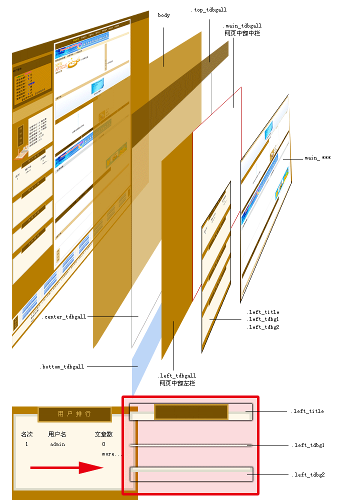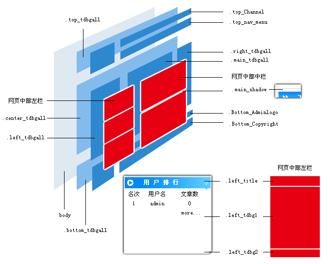 | ·網(wǎng)頁頂部定義的樣式命名為:top_***;  在網(wǎng)頁中部定義中,按其位置劃分為左、中、右三個(gè)區(qū)塊: |