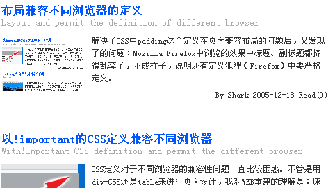 在Opera瀏覽器中瀏覽的效果中,標(biāo)題頂部缺少間距倒也說得過去,至少沒影響頁面效果;Mozilla Firefox中瀏覽的效果中標(biāo)題、副標(biāo)題都擠得亂套了,說明還有定義狐貍(Firefox)中要嚴(yán)格定義,耐心查查吧。