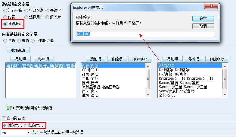 第二步,設(shè)置聯(lián)動項。我們可以看到系統(tǒng)預(yù)定義字段里有“多級聯(lián)動”,選中后即可以設(shè)置總類、一級類別、二級類別等等,理論上SiteFactory? 3.6的聯(lián)動支持無限級擴(kuò)展,不過最常用的是兩至三級聯(lián)動就夠了。此外,多級聯(lián)動還支持橫向顯示及縱向顯示。