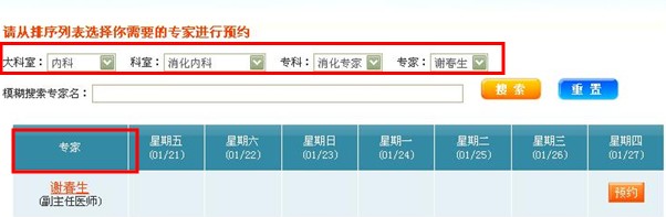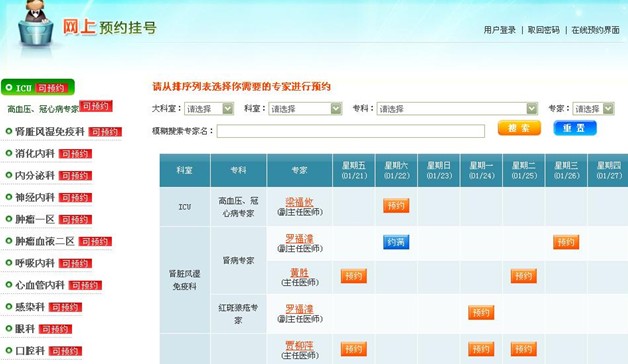 經(jīng)過上一步的操作,我們現(xiàn)在已經(jīng)進(jìn)入預(yù)約頁(yè)面了,大家可以在下面的截圖中看到,頁(yè)面呈現(xiàn)出了科室、專家的排班時(shí)間、是否可預(yù)約等信息,我們可以進(jìn)行仔細(xì)的查看,根據(jù)頁(yè)面提供的信息確定我們需要預(yù)約的專家情況。