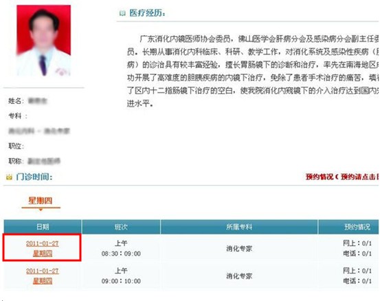 進(jìn)入預(yù)約界面后,系統(tǒng)會(huì)自動(dòng)顯示出專家的醫(yī)療經(jīng)歷、門診時(shí)間等信息供我們查看,只要點(diǎn)擊下圖紅框中的預(yù)約日期后,根據(jù)下一步的提示進(jìn)行簡(jiǎn)單操作,便完成了整個(gè)預(yù)約掛號(hào)的流程,接下來你要做的就是準(zhǔn)時(shí)赴約進(jìn)行診療了。